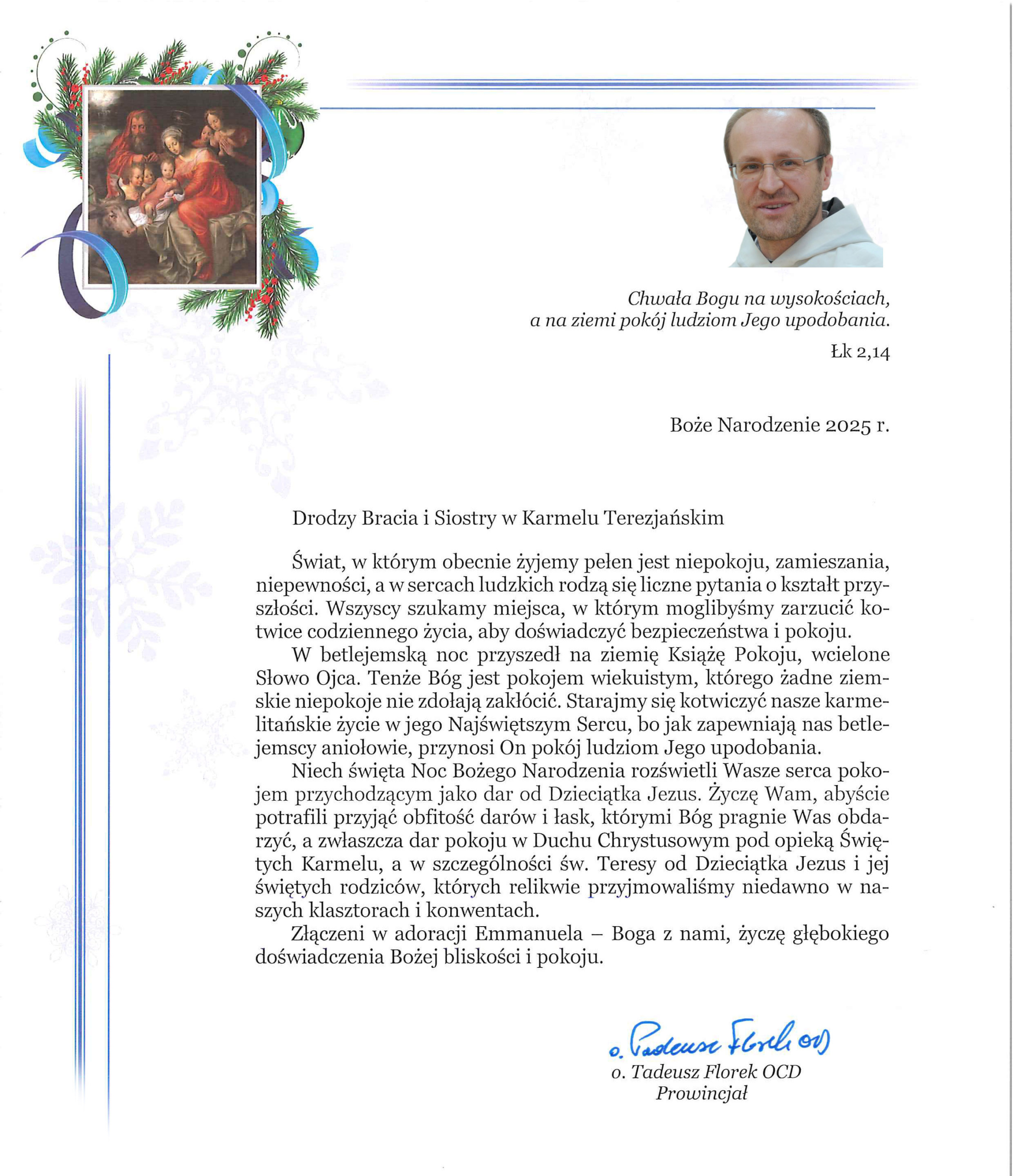 • Życzenia Bożonarodzeniowe od o. Prowincjała Tadeusza Florka OCD 15 grudnia 2025